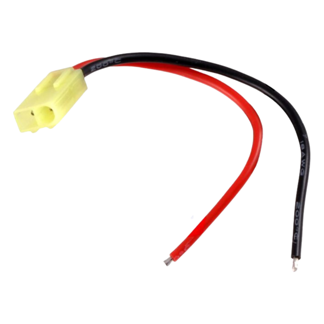 This connector, a smaller version of the female Tamiya plug, is commonly used with battery packs for RC applications. The connector is keyed so that power cannot be reversed, and a latch secures the connection so that it will not become disconnected. This female mini Tamiya connector has 10 cm 18-AWG leads with stripped and tinned terminations.