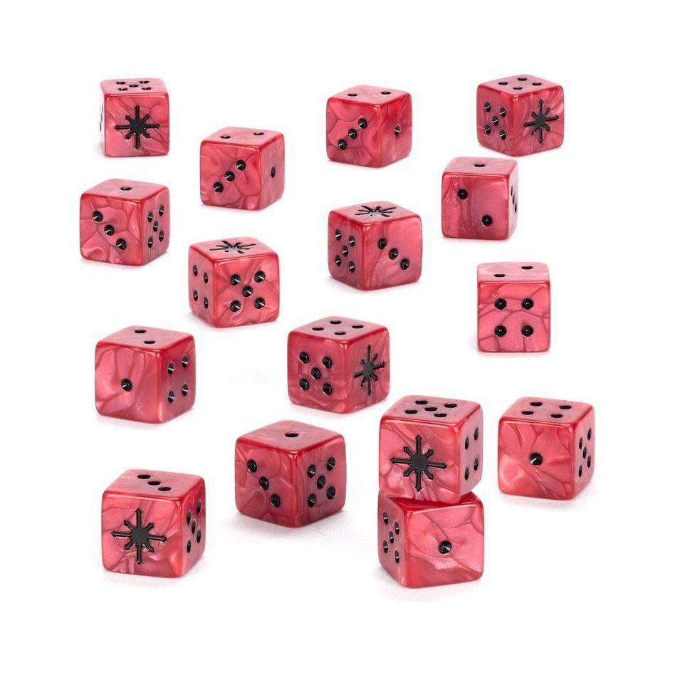A set of 16 six-sided dice for games of Warhammer 40,000, themed around the Chaos Space Marines. These dice are cast in a sinister pearlescent red plastic, with black markings. The 1-5 facings are traditionally pipped, but each '6' facing is etched with the eight-pointed star icon of Chaos.