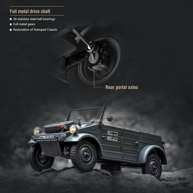 Having already released the Allied Jeep, it felt only right to deliver the Axis equivalent in the form of a 1/12th scale Kübelwagen Type 82. The rear mounted air-cooled engine has been faithfully recreated to mirror the original, an engine that lasted for 65 years in the classic VW Beetle with production finally halting in Mexico, 2003. The 985cc engine was later upgraded to 1131cc, and then gradually increased displacement with the Porsche 356 using a 1488cc engine, doubling the horsepower from the original. The cylinders of the horizontally opposed engine are distributed on both sides, a 130 motor in the right cylinder position, and another 130 motor reserved for the left side, which can output twice as much power when applied to the VW T1 or Porsche 356 platform. The engine crankshaft flywheel is connected by a belt to drive the generator and the cooling fan as well. The semi-circular fan fairing is a major feature, in which the airflow is distributed to the cylinders on both sides. All is restored within the 1/12th model, so that you can observe the blades rotating through the fan intake when the motor is running. The real Kübelwagen had 4 forward gears with the maximum speed when in each gear as follows, 1st gear 18.4km/h; 2nd gear 32.4km/h; 3rd gear 54.2km/h; 4th gear 83.6km/h. The corresponding red line gearshift tips is available on the dashboard. On the model, we designed a 2-speed shift to simulate the speed of the 1st and 3rd gears of the real car. Power crosses over from the top of the rear axle differential and then returns to the rear axle. The model shares the same structure as the real engine, with the benefit of compactness, making it easy to switch between 4WD and RWD modes. This shift function via a simple button on the transmitter is perfectly reproduced on the model to provide more control when driving off-road.