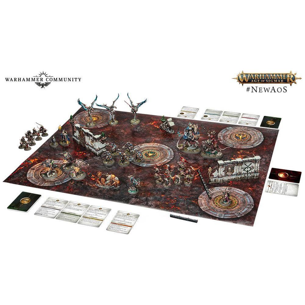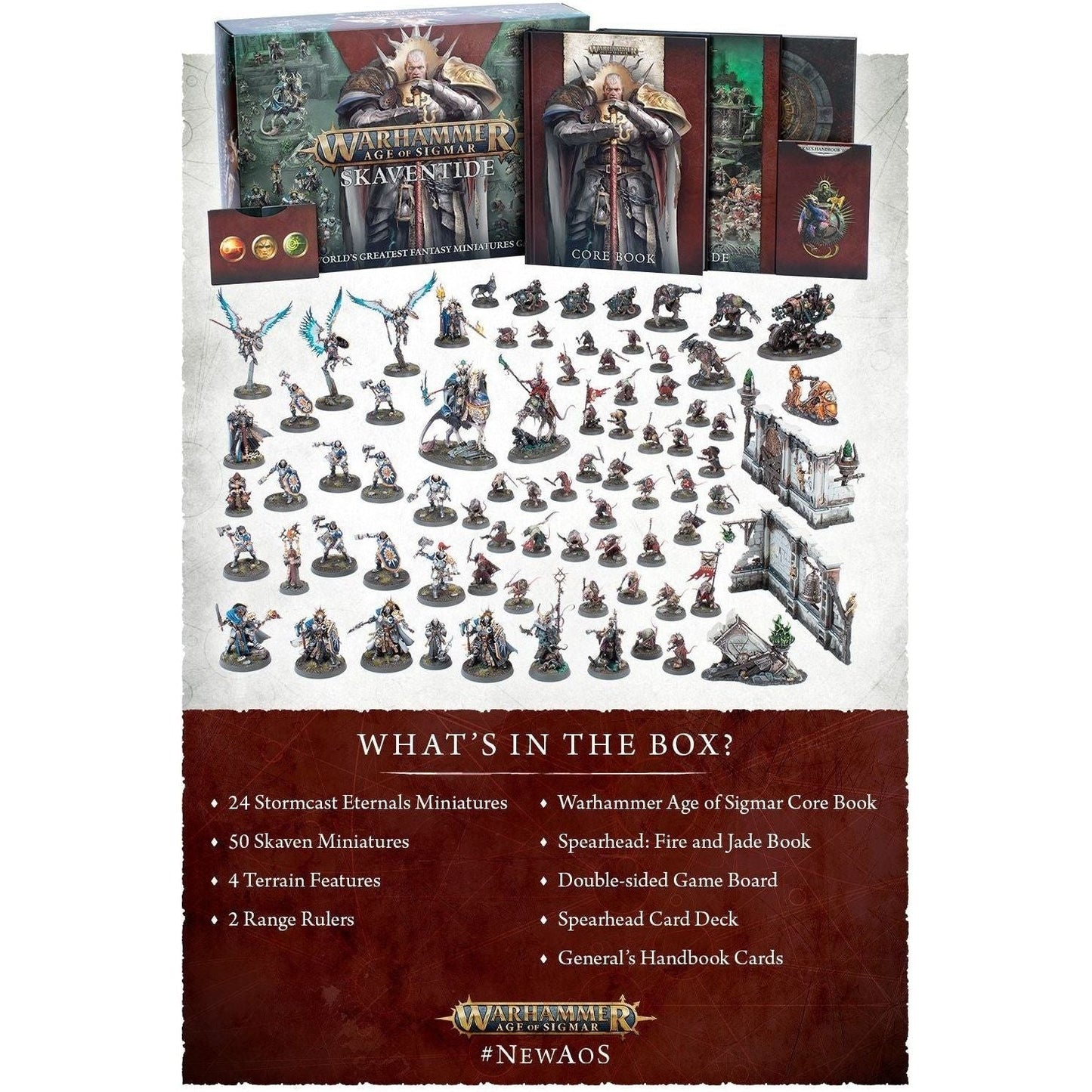 The box is divided into two sides coming in at 1,200 points. There are 24 Stormcast Eternals, reforged warriors and grizzled veterans of a thousand conflicts, and 50 Skaven, swarming horrors who fight with overwhelming numbers, foul magics, and madcap technology.