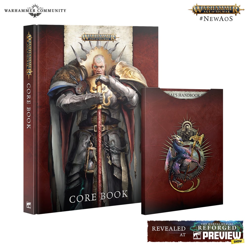 On top of all that, there’s the 272-page Warhammer Age of Sigmar Core Book. This weighty grimoire contains masses of lore and background information about the Mortal Realms and their inhabitants, alongside reams of gorgeous art and atmospheric photography of miniatures painted by the ’Eavy Metal team. It includes the Core Rules, the battlepacks for Matched Play (First Blood), and Path to Glory (Ascension), a rules glossary, a Citadel Terrain List, and copyable Path to Glory and Army rosters.
